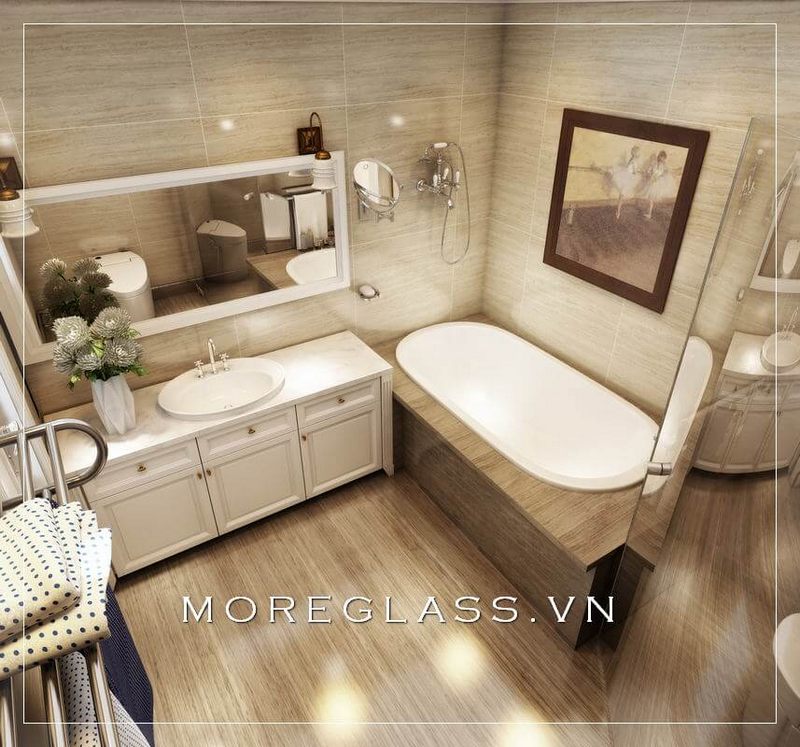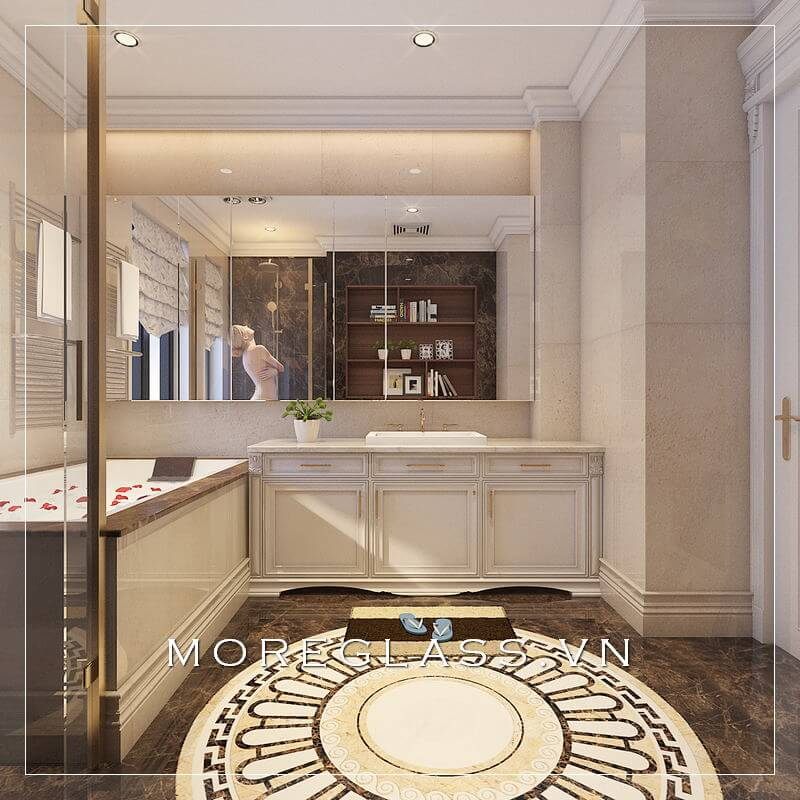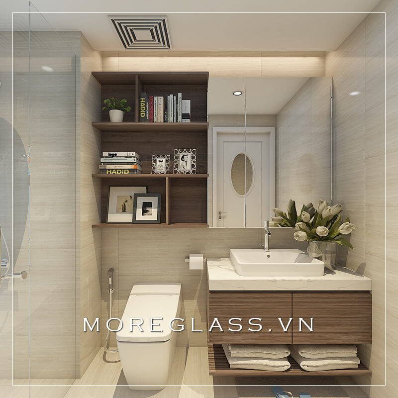 Mẫu thiết kế phòng tắm cao cấp kết hợp vách tắm kính vời kệ tủ độ nhỏ nhắn đang được ưa chuộng hiện nay