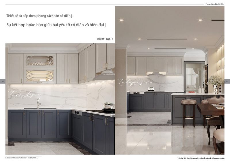 Mẫu tủ bếp gỗ tân cổ điển với thiết kế chữ L cùng thiết bị bếp hiện đại mang đến sự tiện nghi cho người nội trợ