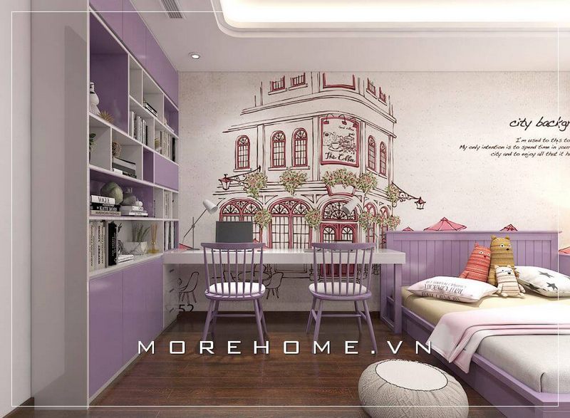 Không gian phòng ngủ của bé trở nên nhẹ nhàng khi KTS lựa chọn mẫu giấy dán tường trẻ em màu hồng thể hiện cá tính và sở thích của bé