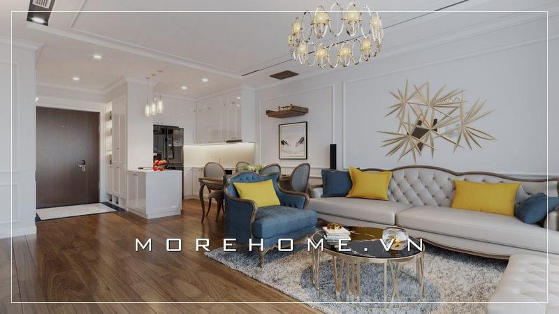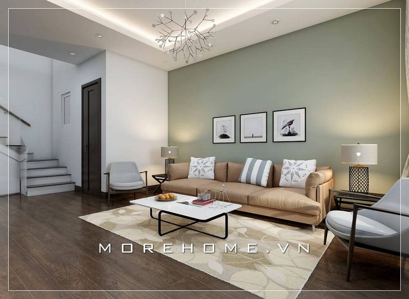 Sự kết hợp độc đáo của mẫu sofa tân cổ điển vỏ bọc da cao cấp được thiết kế theo kiểu văng đơn giản với ghế sofa đơn bọc nhung ấm áp và màu xanh tươi mới là trung tâm ấn tượng của phòng khách chung cư
