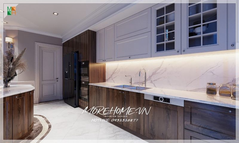 Mẫu tủ bếp có màu nâu tự nhiên và thiết kế kiểu dáng chữ L, mang lại sự sang trọng và tiện nghi cho phòng bếp.