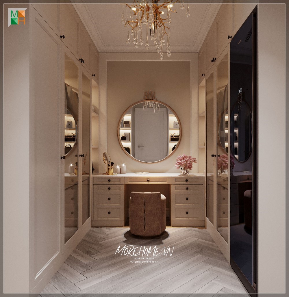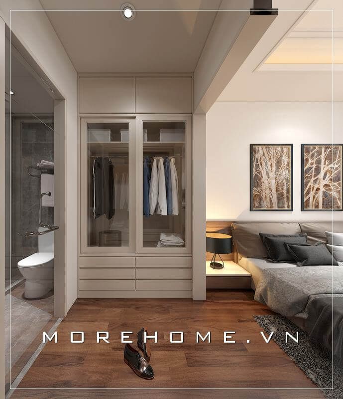 Tủ quần áo hiện đại màu trắng sẽ làm nổi bật phong cách sang trọng của phòng ngủ.